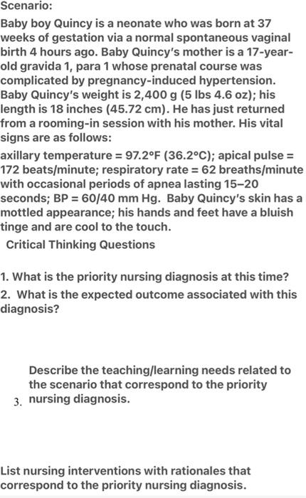 Solved Scenario Baby Boy Quincy Is A Neonate Who Was Born Chegg Com